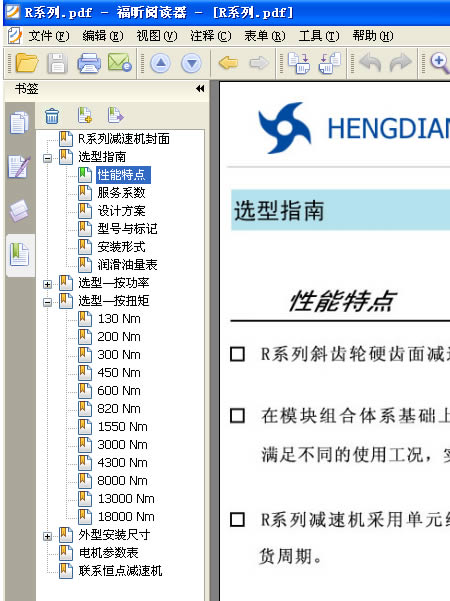 4: 打開一個PDF文件後,本例以打開 恒點傳動公司的R系列産品爲示範,看下軟件的左上角,如下圖 :