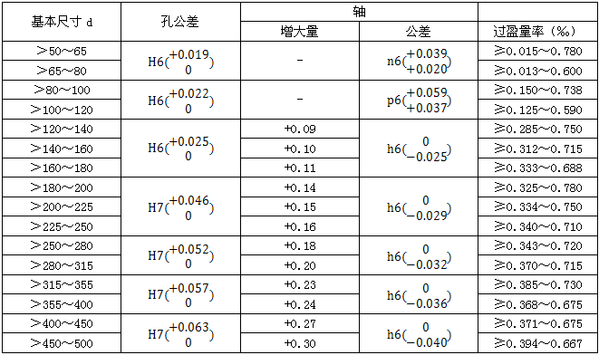 爲瞭保證齒輪的傳動精度,和防止齒輪孔與軸之間可能因産生間隙 ,而導緻腐蝕現象,所以當齒輪及採用H6,H7公差帶 ,軸採用h6公差帶時,将軸的名義尺寸加一增大量,進行輕熱配合,表1-146中所列的輕熱壓配合尺寸,僅适用於鍵聯結的情況下。
