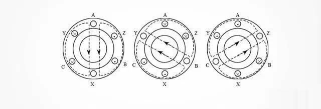 當(dāng)交流電相位θ=2400時 ,IC=0,IA爲負,IB爲正,此時,線端C、Z沒有電流,繞組AX電流從(cóng)X流進A流出 ,繞組BY電流從(cóng)B流進Y流出,由安培右手螺旋定則得到圖(c)中磁感線方向(如虛線箭頭所示)。