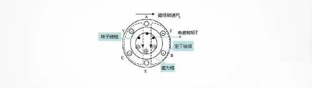 由於(yú)旋轉磁場不斷切割轉子中的閉合導體,産生感應電動勢和感應電流,再由轉子中的感應電流和旋轉磁場的相互作用産生電磁轉矩,使得轉子随著(zhe)旋轉磁場的方向同向運轉 。比如籠型異步電動機,由於(yú)旋轉磁場順時針切割轉子導體,相當於(yú)導體逆時針轉動,運用右手定則,讓磁感線垂直穿過手心,拇指指向導體的運動方向,四指的方向就是感應電流的方向(如圖4所示籠型異步電動機轉子繞組電流的方向),然後應用左手定則,磁感線穿過手心,四指指向電流運動方向,大拇指方向即爲轉子受到電磁力的方向(如圖所示電磁轉矩矩T方向),在電磁力的作用下形成電磁轉矩,拖動轉子順著(zhe)旋轉磁場的方向轉動。