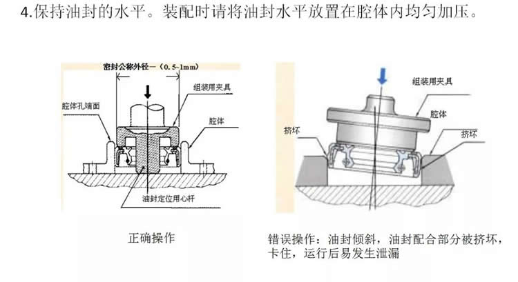 2.油封要平裝,不能有傾斜的現象。建議採(cǎi)用油壓設備(bèi)或套筒工具安裝。壓力不要太大,速度要均勻 、要慢。