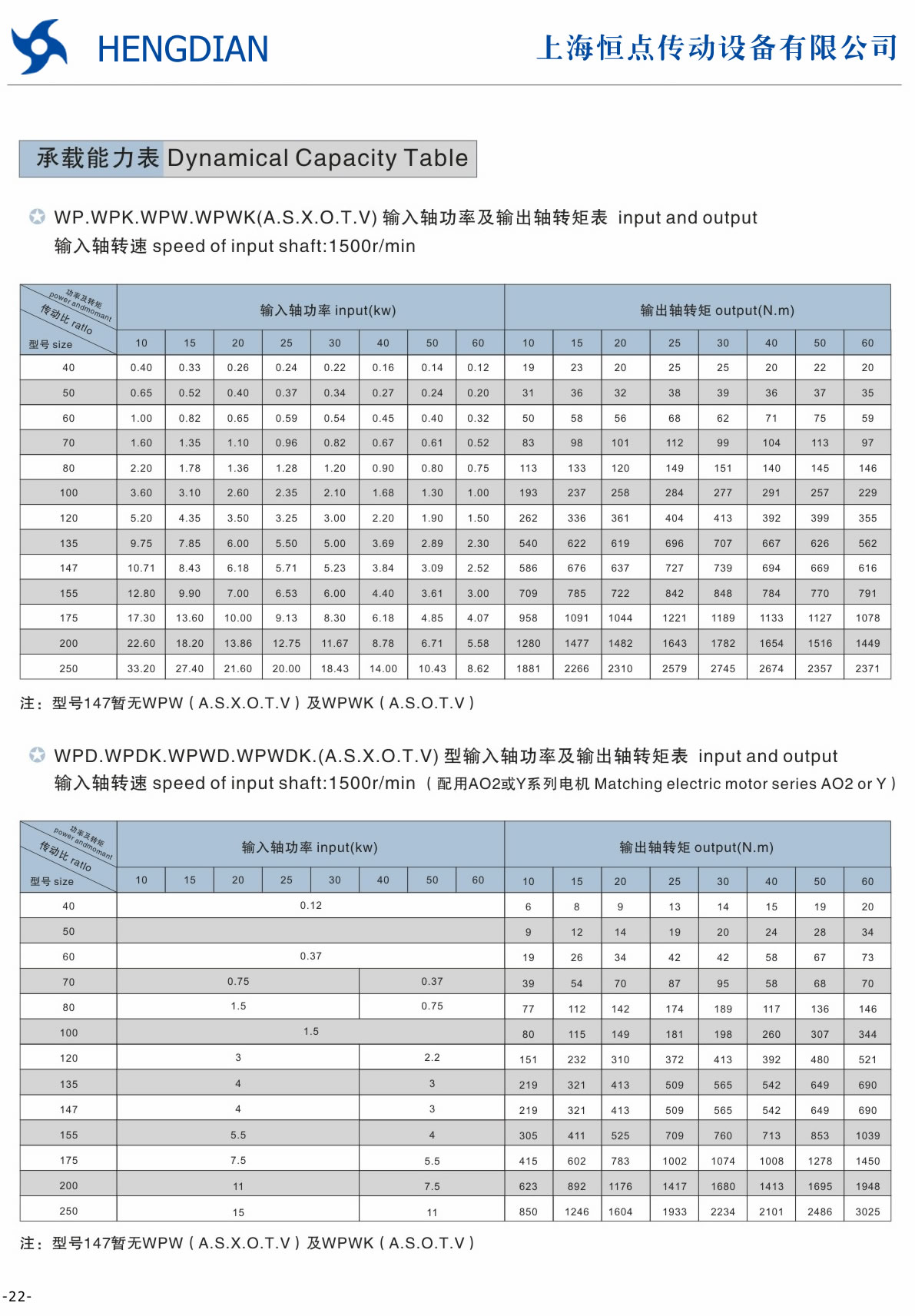 > WP系列蝸輪蝸杆減速機承載能力表