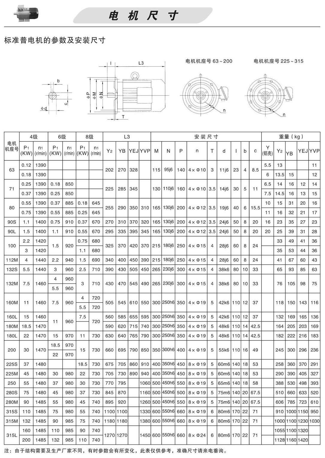标準普電機的參數及安裝尺寸,包括立式電機的常用類型(Y2,YEJ,YVP,YB)的四級,六級,八級所對應的長度,重量.非标電機尺寸需要另外注明: