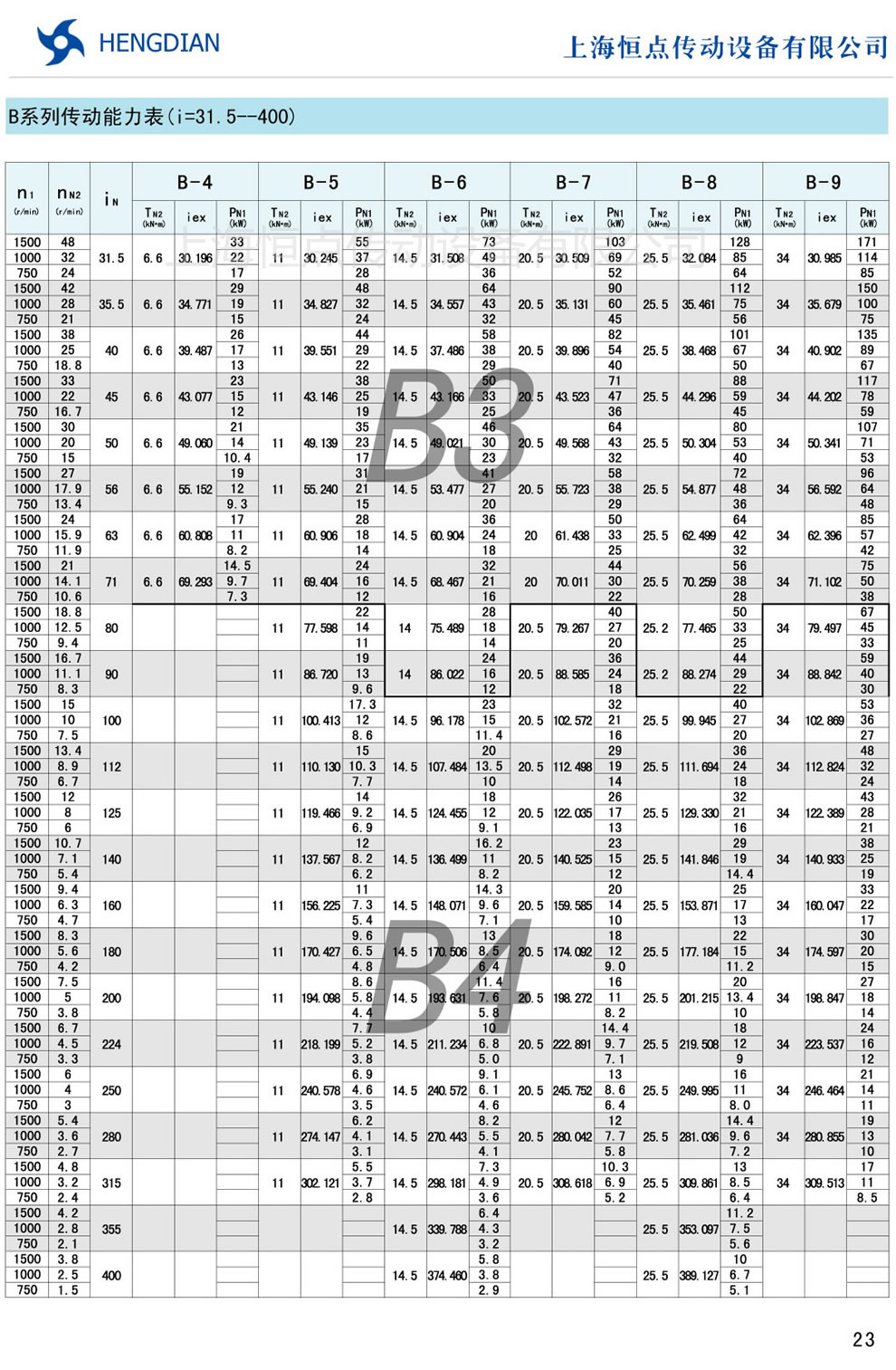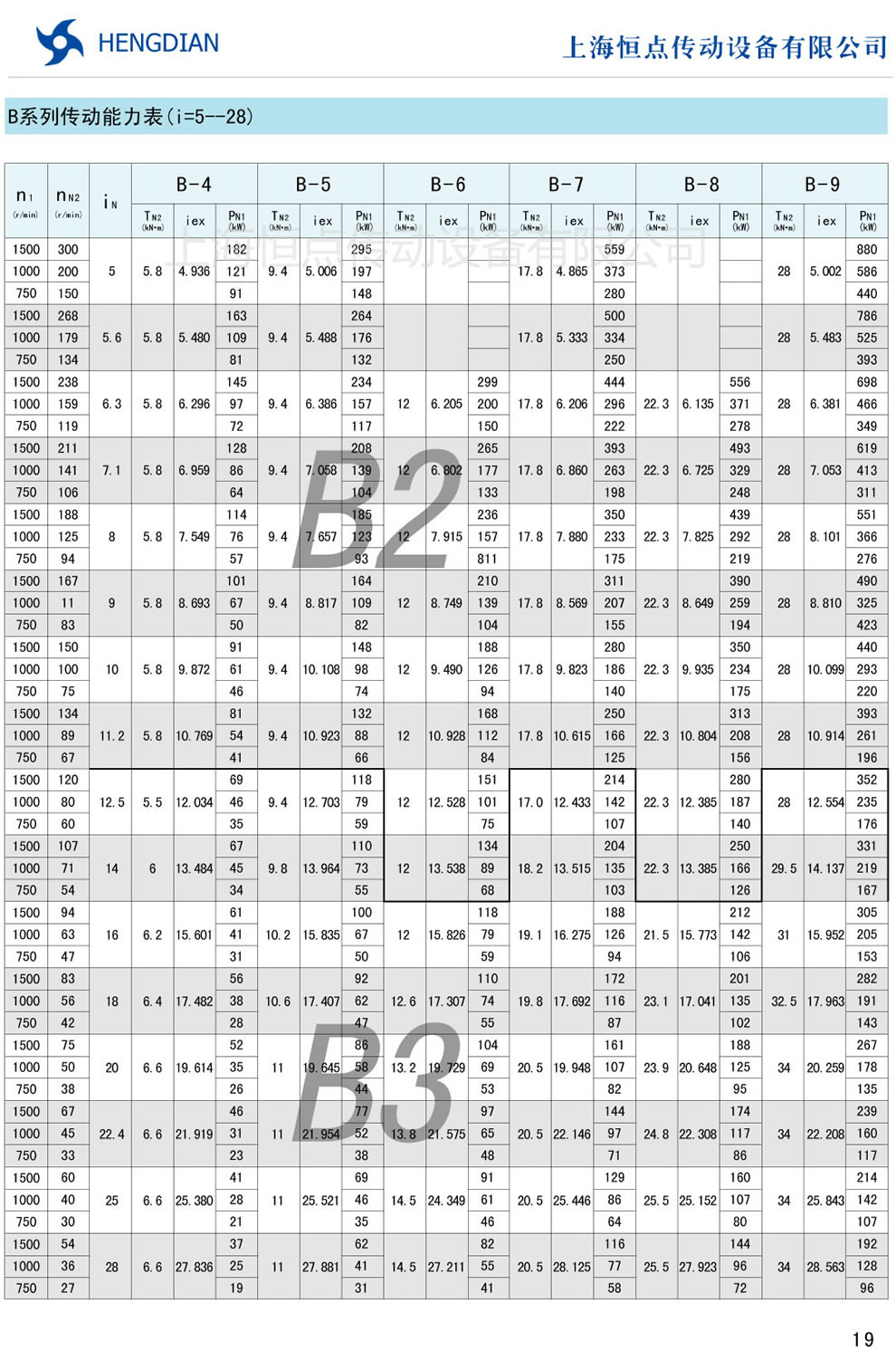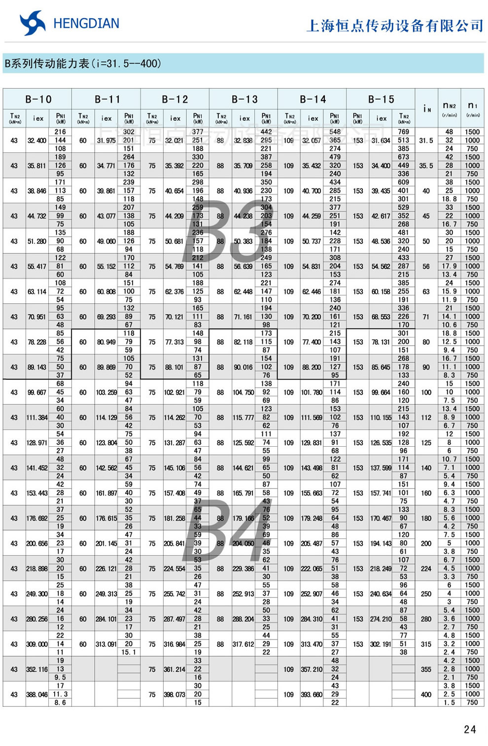 B系列傳動能力表 - HB标準工業齒輪箱