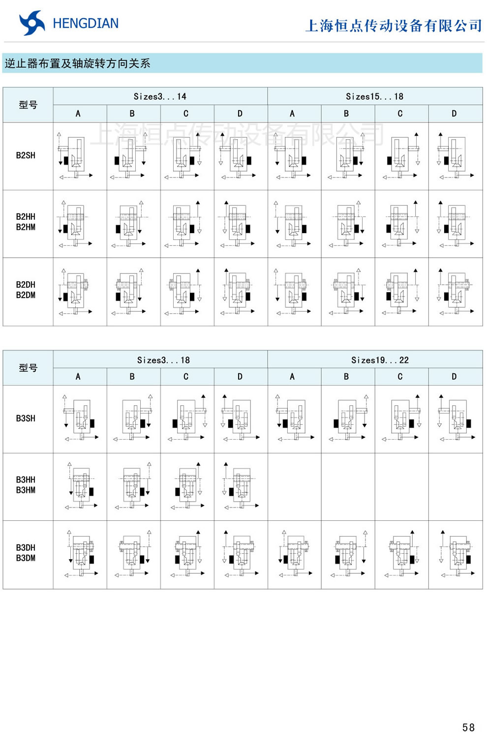 逆止器布置及軸旋轉方向 - HB标準工業齒輪箱