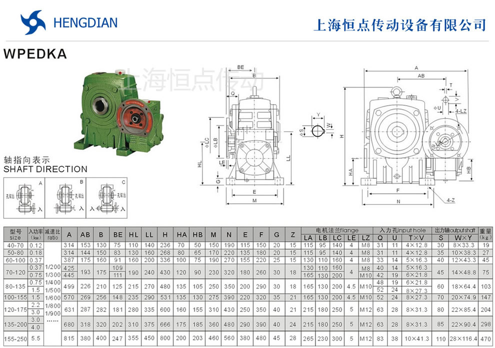 WPEDKA雙級減速機的外形安裝尺寸.WPEDKA雙級蝸輪蝸杆減速機選型指南,WPEDKA雙級減速機法蘭輸入,孔輸出.WPEDKA減速機軸指向表示方法.機座号40-70到155-250,速比200到900.